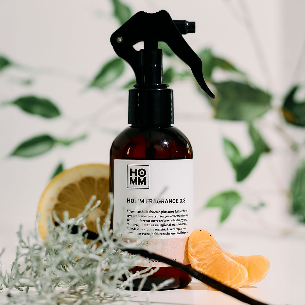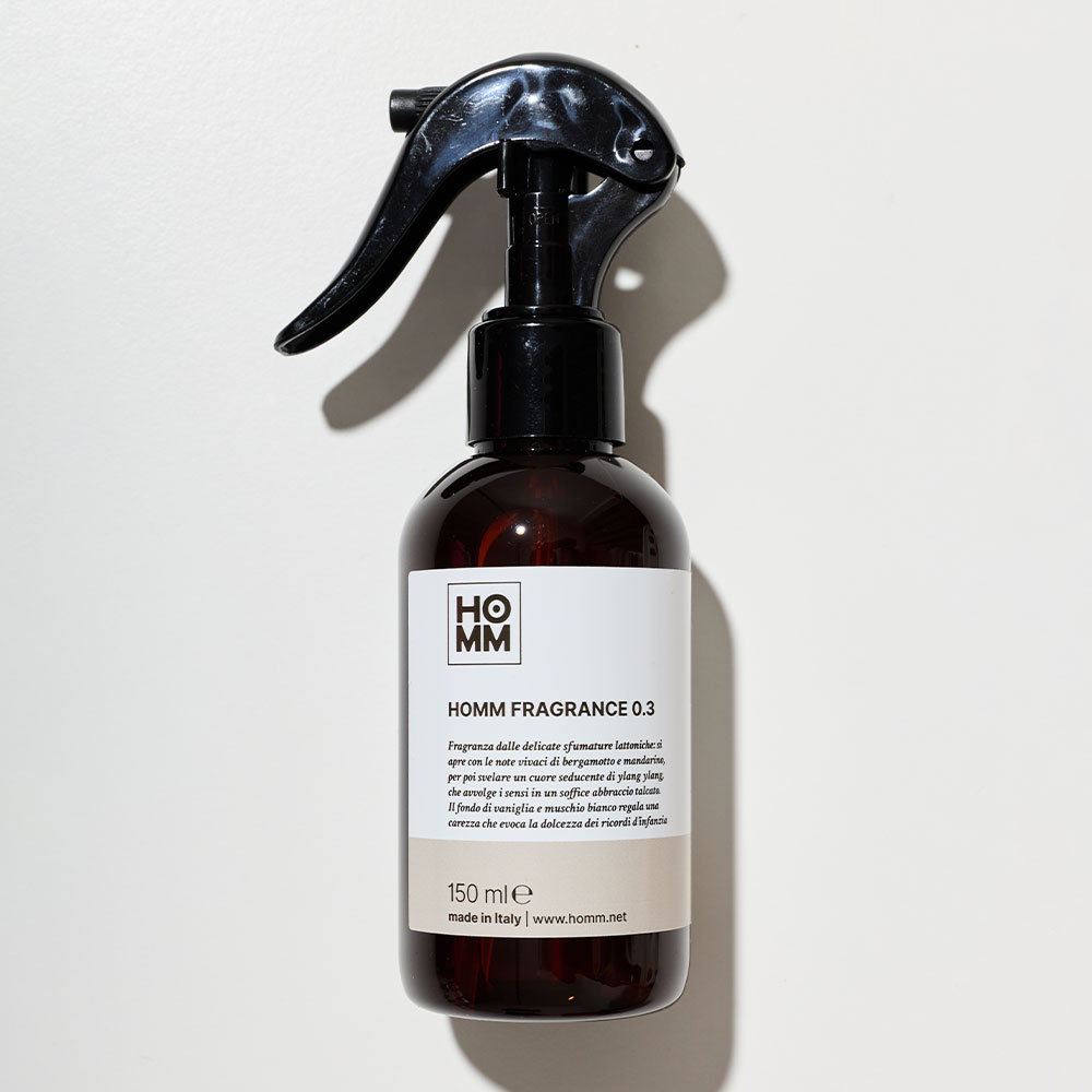 Diffonde l’aroma Homm negli ambienti. Fragranza dalle delicate sfumature lattoniche: si apre con le note vivaci di bergamotto e mandarino, per poi svelare un cuore seducente di ylang ylang, che avvolge i sensi in un soffice abbraccio talcato. Il fondo di vaniglia e muschio bianco regala una carezza che evoca la dolcezza dei ricordi d’infanzia.